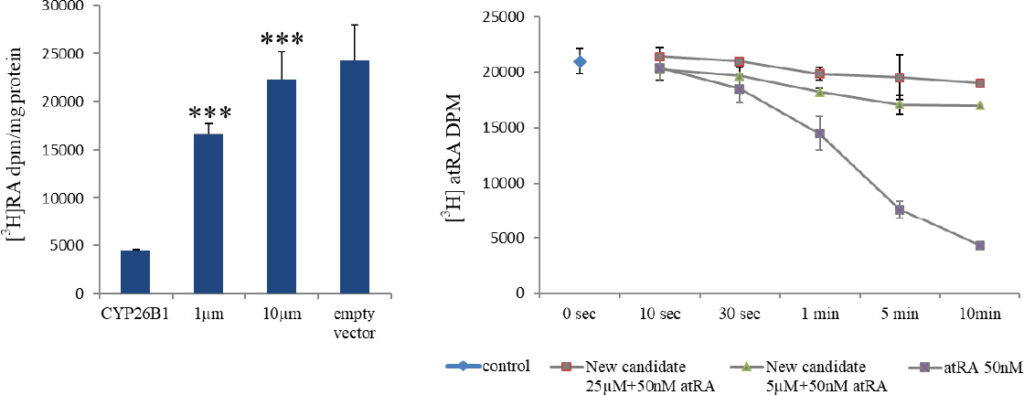 NOVELTY: The compound, C26-1, inhibits CYP26B1 and blocks degradation of cellular Retinonic Acid (RA) in tissue. This can replace treatment with externally applied retinoids or antibiotics and thus be safe and more effective than current treatments.